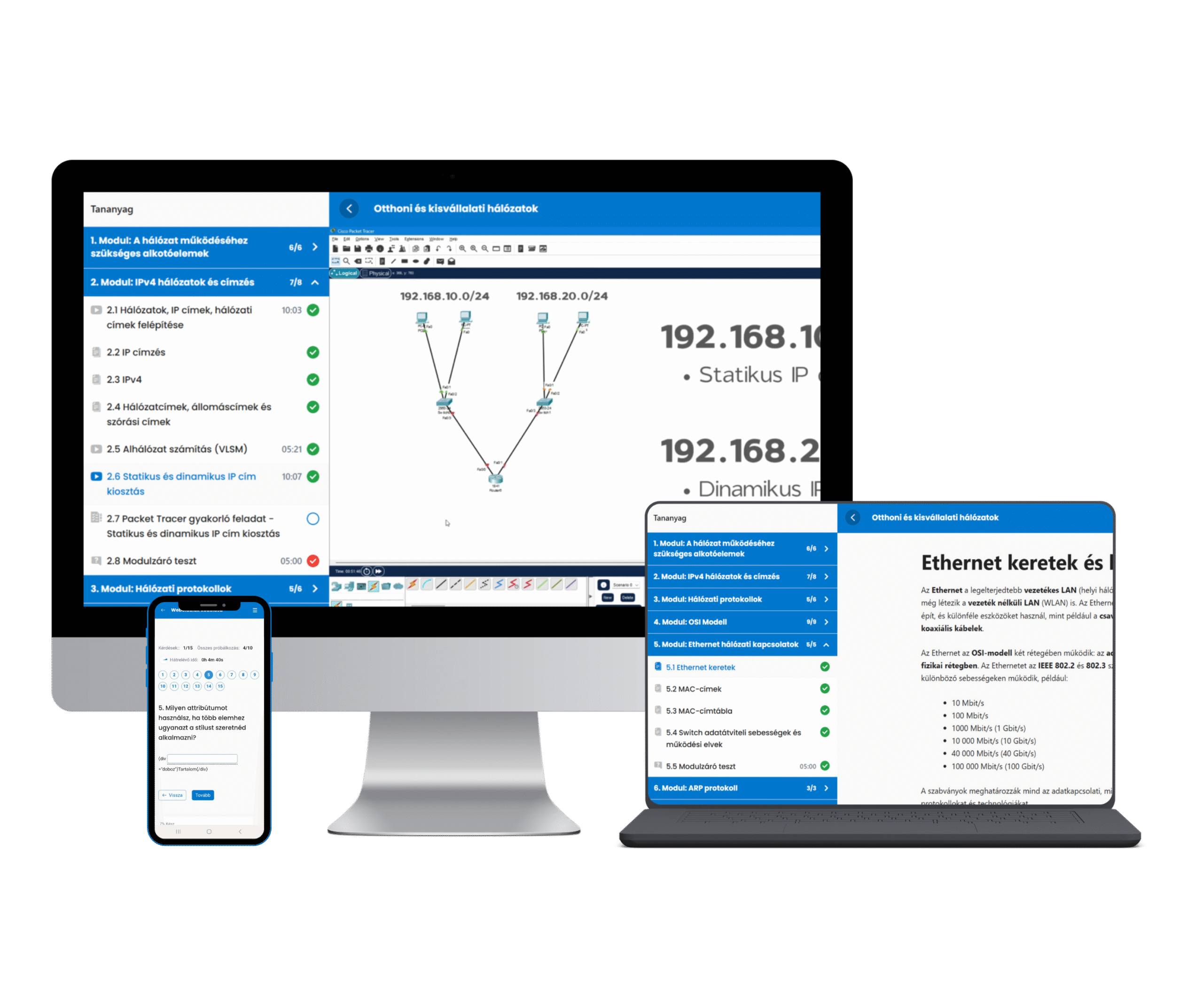 Az E-Learning kurzusaink modulokra vannak bontva, és minden modul több leckét tartalmaz. A leckék videókból, elméleti jegyzetekből, gyakorló feladatokból és tesztekből állnak, így változatosan sajátíthatod el az anyagot.